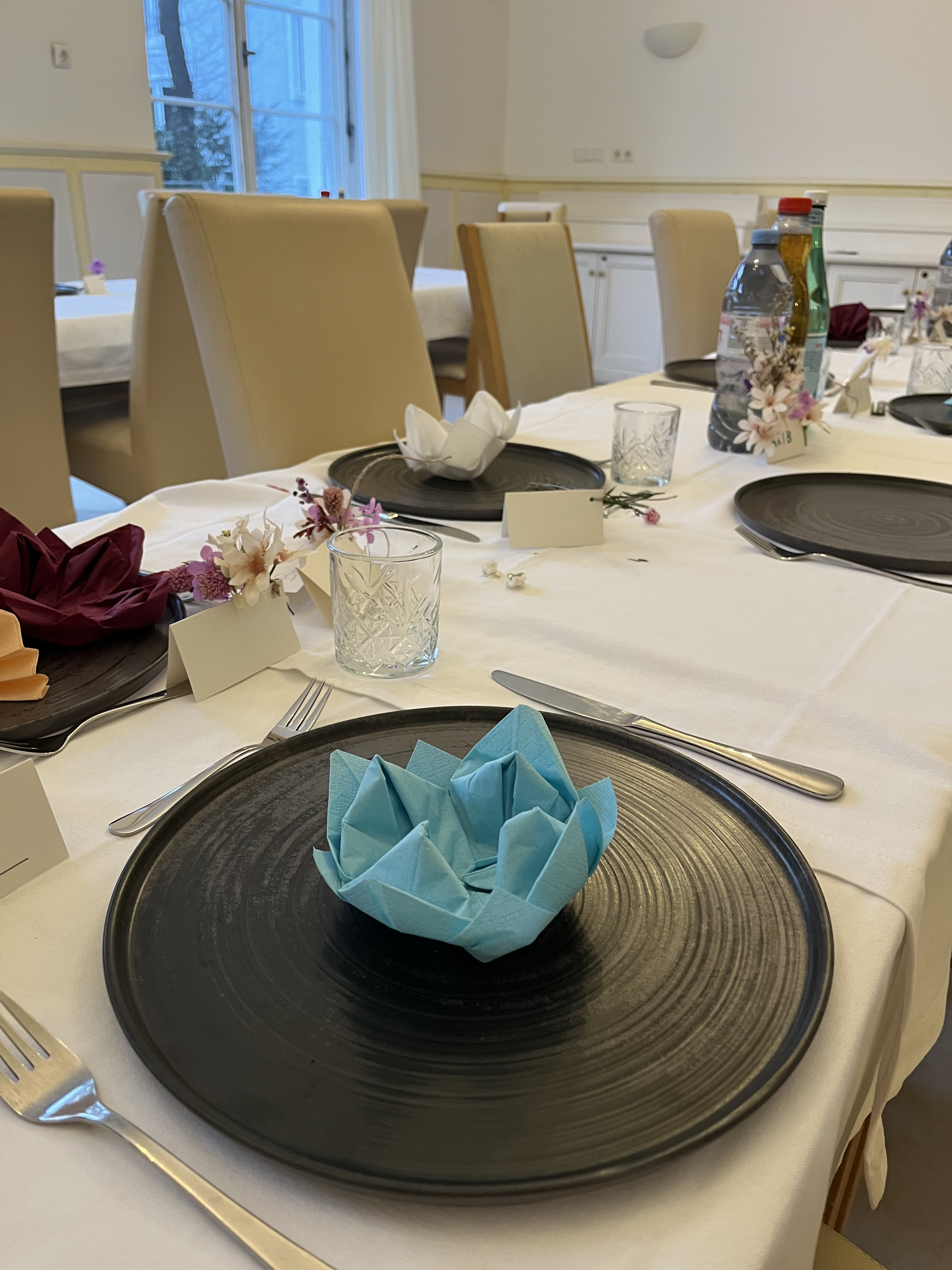 Dabei lernten sie verschiedene Techniken des Serviettenfaltens kennen, darunter den Fächer, die Seerose sowie den einfachen und doppelten Tafelspitz. Außerdem wurde das richtige Eindecken eines Tisches anschaulich erklärt und gemeinsam geübt.